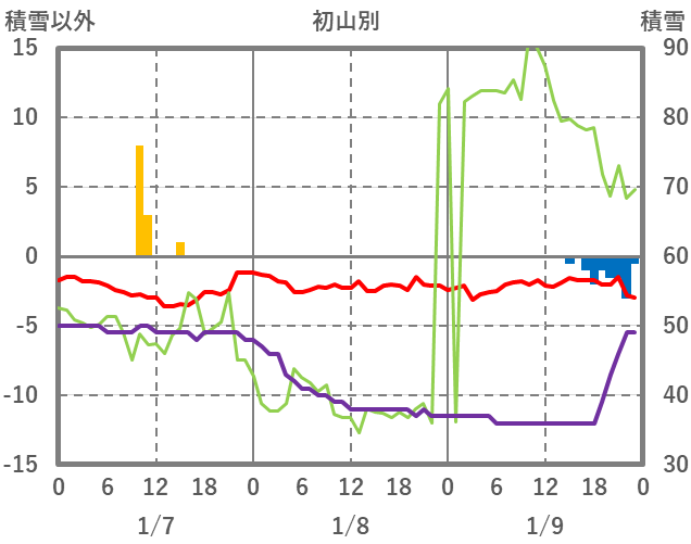 | 日 | 時 | 気温 | 降水 | 風向/風速 | 日照 | 積雪 | 降雪 |