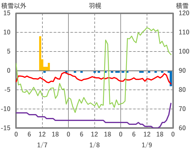 | 日 | 時 | 気温 | 降水 | 風向/風速 | 日照 | 積雪 | 降雪 |
