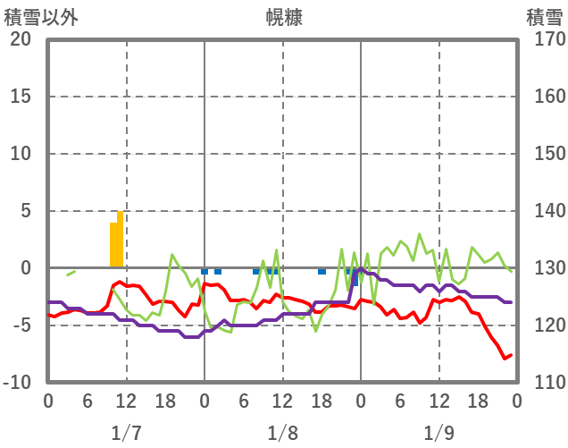 | 日 | 時 | 気温 | 降水 | 風向/風速 | 日照 | 積雪 | 降雪 |