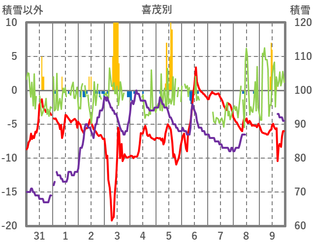 | 日 | 時 | 気温 | 降水 | 風向/風速 | 日照 | 積雪 | 降雪 |