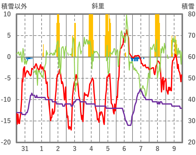 | 日 | 時 | 気温 | 降水 | 風向/風速 | 日照 | 積雪 | 降雪 |