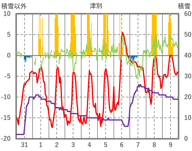 | 日 | 時 | 気温 | 降水 | 風向/風速 | 日照 | 積雪 | 降雪 |