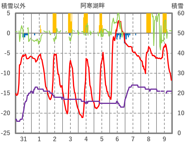 | 日 | 時 | 気温 | 降水 | 風向/風速 | 日照 | 積雪 | 降雪 |