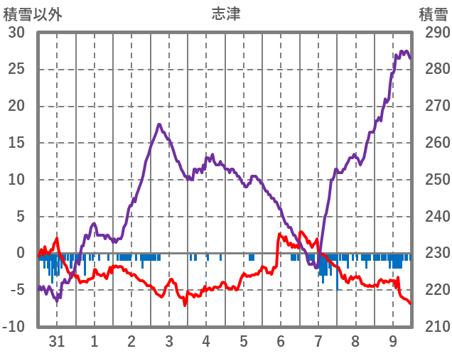 | 日 | 時 | 気温 | 降水 | 風向/風速 | 日照 | 積雪 | 降雪 |