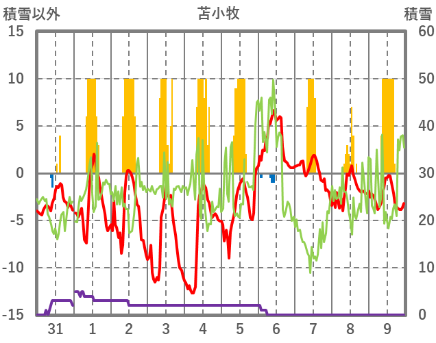 | 日 | 時 | 気温 | 降水 | 風向/風速 | 日照 | 積雪 | 降雪 |