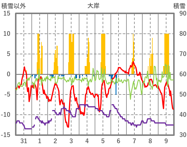 | 日 | 時 | 気温 | 降水 | 風向/風速 | 日照 | 積雪 | 降雪 |