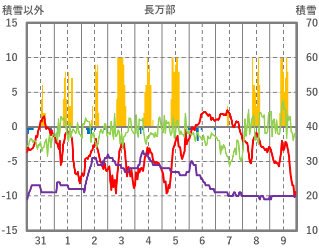 | 日 | 時 | 気温 | 降水 | 風向/風速 | 日照 | 積雪 | 降雪 |