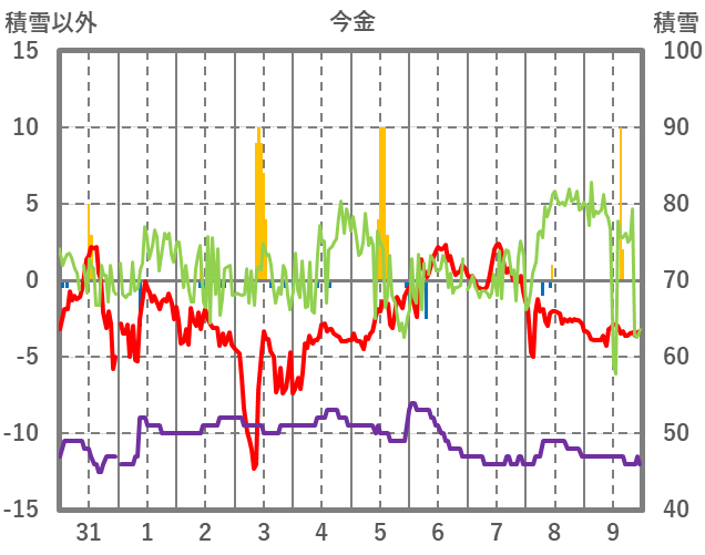 | 日 | 時 | 気温 | 降水 | 風向/風速 | 日照 | 積雪 | 降雪 |