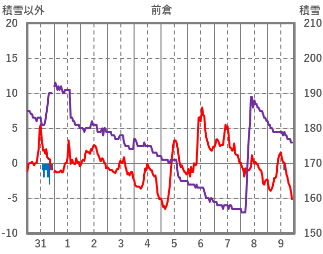 | 日 | 時 | 気温 | 降水 | 風向/風速 | 日照 | 積雪 | 降雪 |