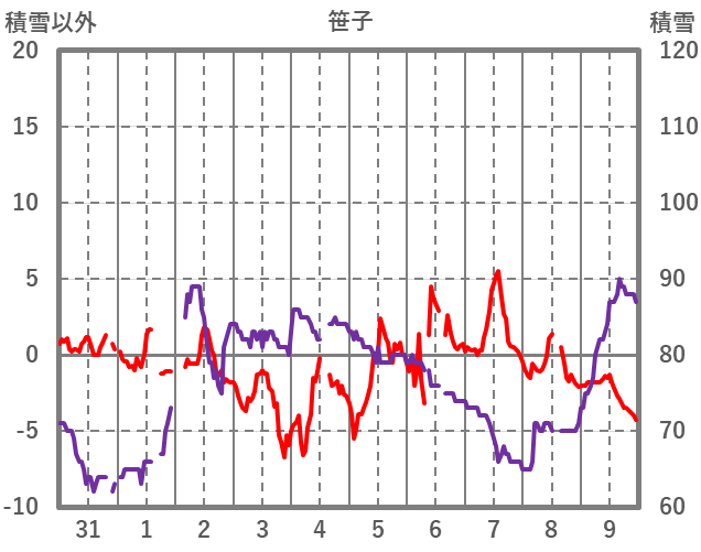 | 日 | 時 | 気温 | 降水 | 風向/風速 | 日照 | 積雪 | 降雪 |