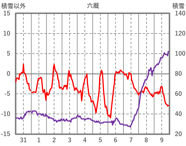 | 日 | 時 | 気温 | 降水 | 風向/風速 | 日照 | 積雪 | 降雪 |