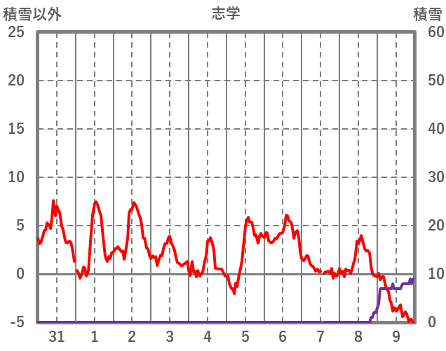 | 日 | 時 | 気温 | 降水 | 風向/風速 | 日照 | 積雪 | 降雪 |