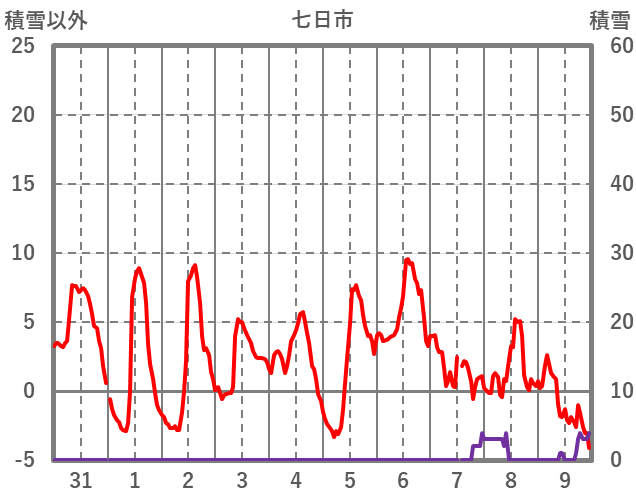 | 日 | 時 | 気温 | 降水 | 風向/風速 | 日照 | 積雪 | 降雪 |