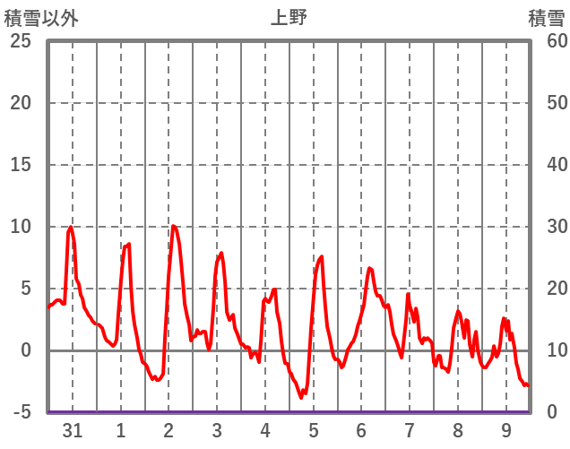 | 日 | 時 | 気温 | 降水 | 風向/風速 | 日照 | 積雪 | 降雪 |