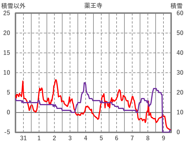 | 日 | 時 | 気温 | 降水 | 風向/風速 | 日照 | 積雪 | 降雪 |