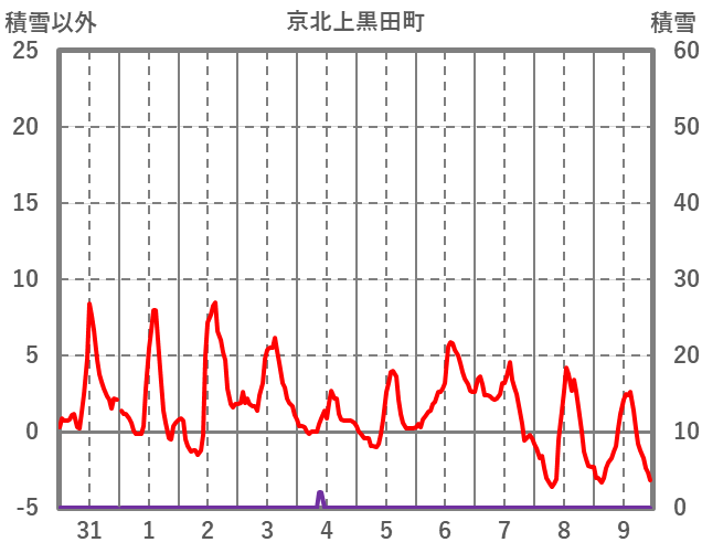 | 日 | 時 | 気温 | 降水 | 風向/風速 | 日照 | 積雪 | 降雪 |