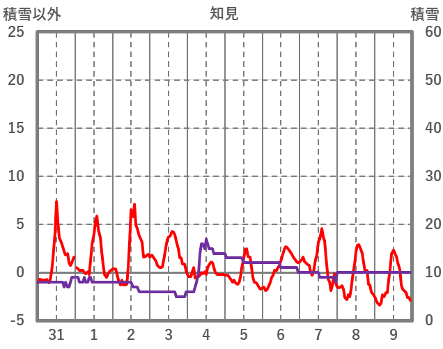 | 日 | 時 | 気温 | 降水 | 風向/風速 | 日照 | 積雪 | 降雪 |