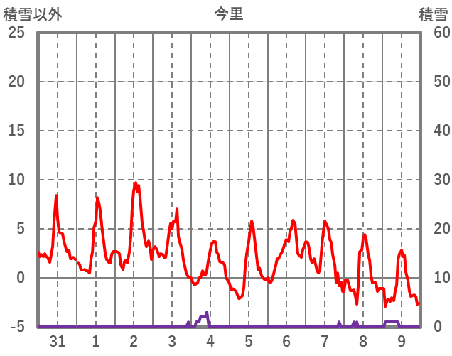 | 日 | 時 | 気温 | 降水 | 風向/風速 | 日照 | 積雪 | 降雪 |