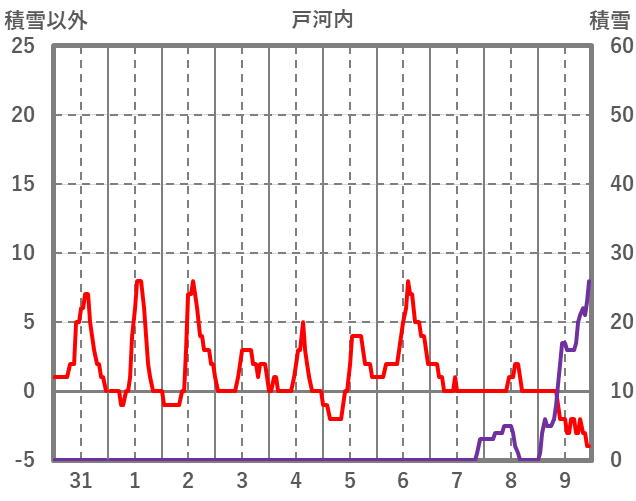 | 日 | 時 | 気温 | 降水 | 風向/風速 | 日照 | 積雪 | 降雪 |