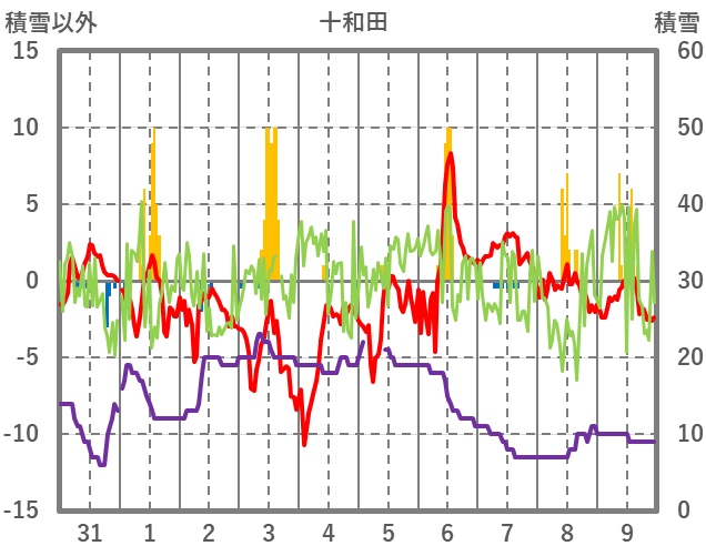 | 日 | 時 | 気温 | 降水 | 風向/風速 | 日照 | 積雪 | 降雪 |