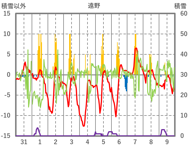 | 日 | 時 | 気温 | 降水 | 風向/風速 | 日照 | 積雪 | 降雪 |