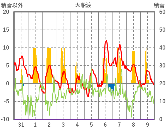 | 日 | 時 | 気温 | 降水 | 風向/風速 | 日照 | 積雪 | 降雪 |