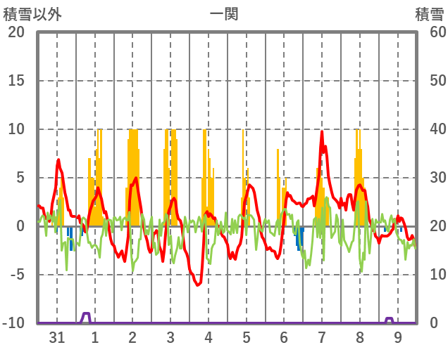 | 日 | 時 | 気温 | 降水 | 風向/風速 | 日照 | 積雪 | 降雪 |