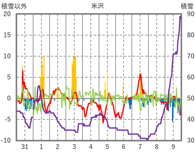 | 日 | 時 | 気温 | 降水 | 風向/風速 | 日照 | 積雪 | 降雪 |