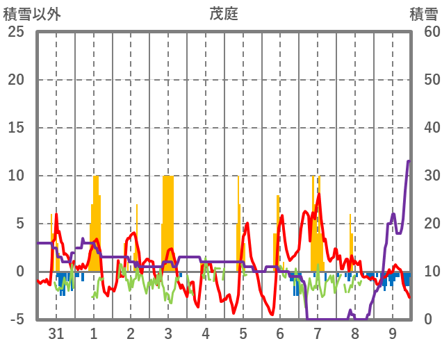 | 日 | 時 | 気温 | 降水 | 風向/風速 | 日照 | 積雪 | 降雪 |
