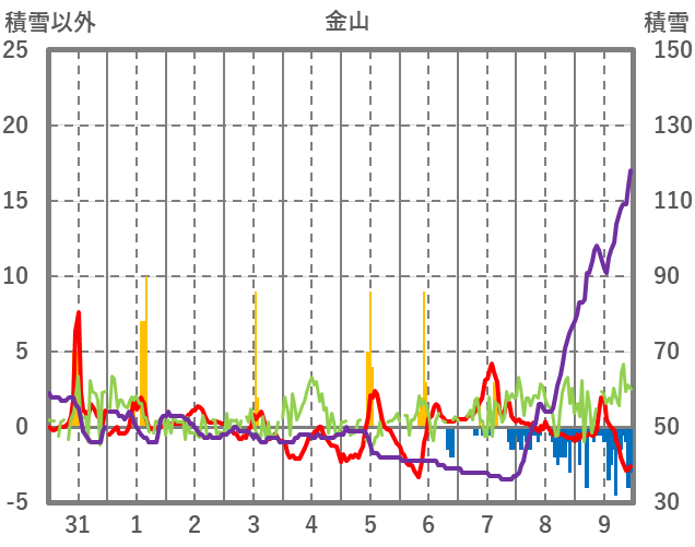 | 日 | 時 | 気温 | 降水 | 風向/風速 | 日照 | 積雪 | 降雪 |