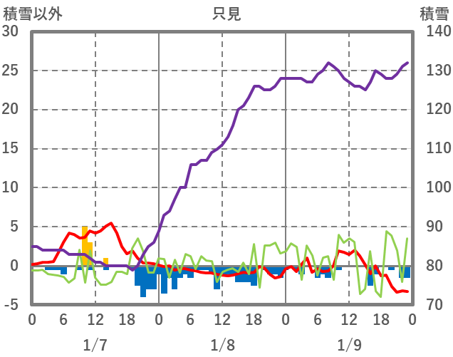 | 日 | 時 | 気温 | 降水 | 風向/風速 | 日照 | 積雪 | 降雪 |