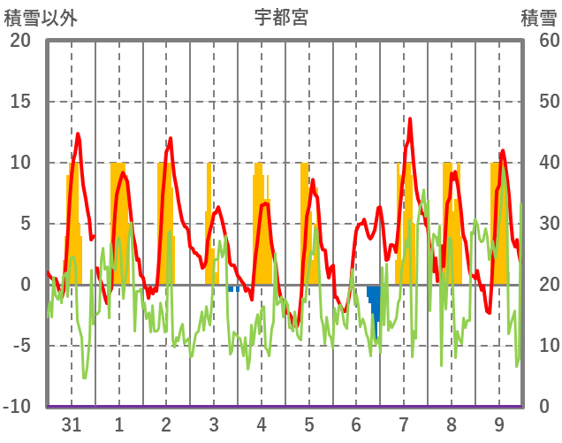 | 日 | 時 | 気温 | 降水 | 風向/風速 | 日照 | 積雪 | 降雪 |