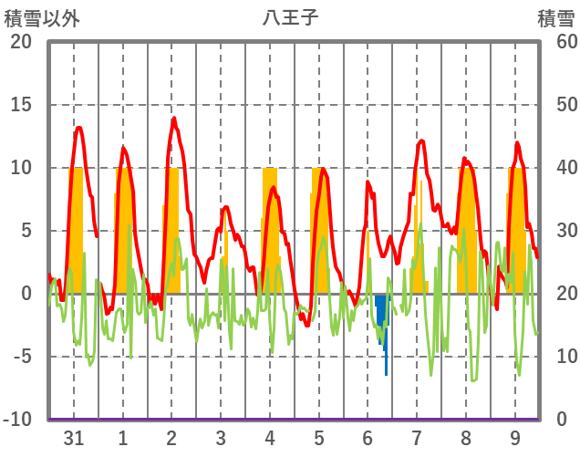| 日 | 時 | 気温 | 降水 | 風向/風速 | 日照 | 積雪 | 降雪 |
