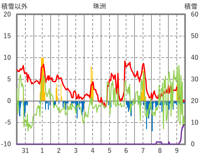 | 日 | 時 | 気温 | 降水 | 風向/風速 | 日照 | 積雪 | 降雪 |