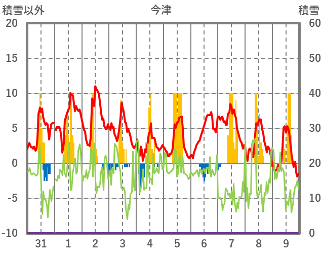| 日 | 時 | 気温 | 降水 | 風向/風速 | 日照 | 積雪 | 降雪 |