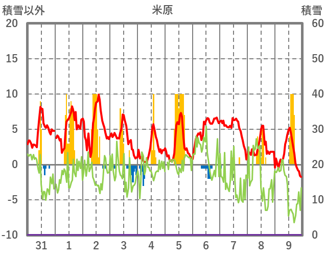 | 日 | 時 | 気温 | 降水 | 風向/風速 | 日照 | 積雪 | 降雪 |