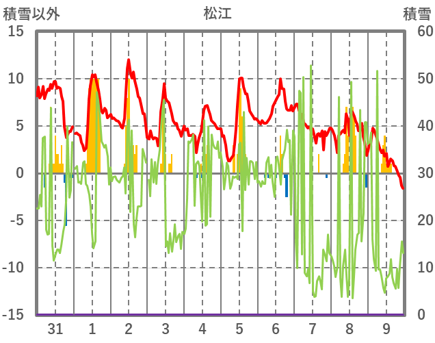 | 日 | 時 | 気温 | 降水 | 風向/風速 | 日照 | 積雪 | 降雪 |