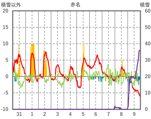 | 日 | 時 | 気温 | 降水 | 風向/風速 | 日照 | 積雪 | 降雪 |
