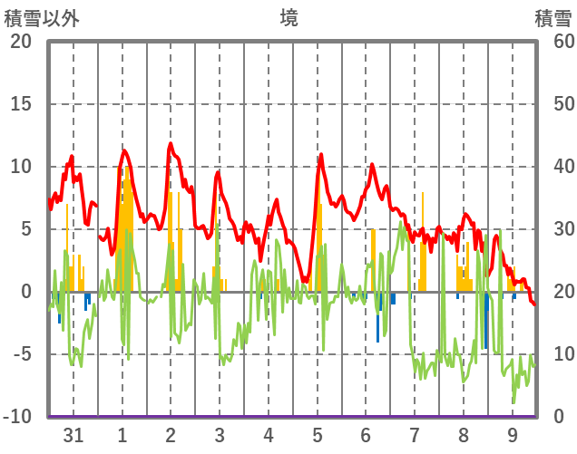 | 日 | 時 | 気温 | 降水 | 風向/風速 | 日照 | 積雪 | 降雪 |