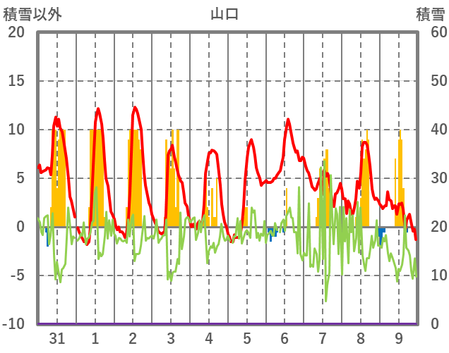 | 日 | 時 | 気温 | 降水 | 風向/風速 | 日照 | 積雪 | 降雪 |