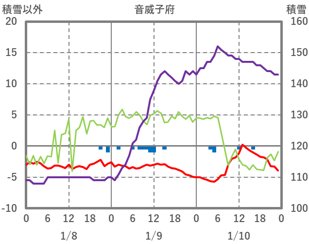 | 日 | 時 | 気温 | 降水 | 風向/風速 | 日照 | 積雪 | 降雪 |