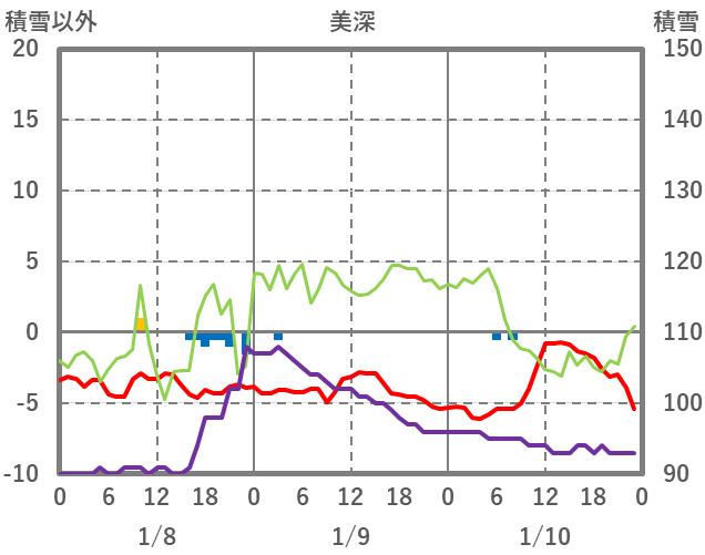 | 日 | 時 | 気温 | 降水 | 風向/風速 | 日照 | 積雪 | 降雪 |