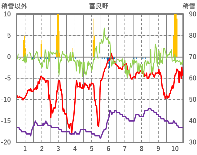 | 日 | 時 | 気温 | 降水 | 風向/風速 | 日照 | 積雪 | 降雪 |