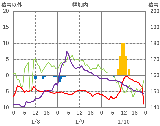 | 日 | 時 | 気温 | 降水 | 風向/風速 | 日照 | 積雪 | 降雪 |