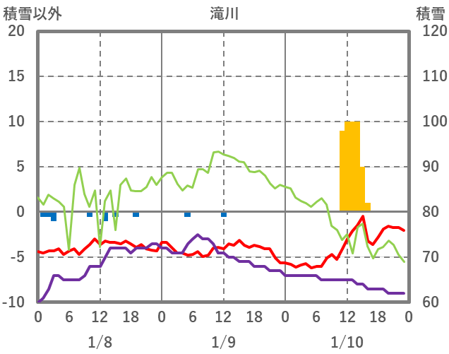 | 日 | 時 | 気温 | 降水 | 風向/風速 | 日照 | 積雪 | 降雪 |