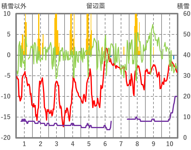 | 日 | 時 | 気温 | 降水 | 風向/風速 | 日照 | 積雪 | 降雪 |