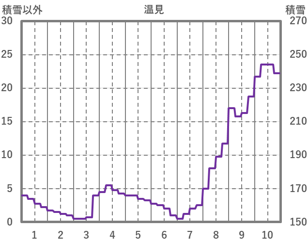 | 日 | 時 | 気温 | 降水 | 風向/風速 | 日照 | 積雪 | 降雪 |