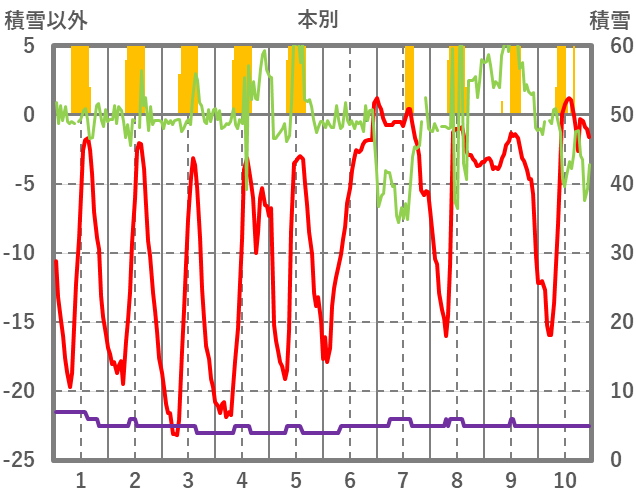 | 日 | 時 | 気温 | 降水 | 風向/風速 | 日照 | 積雪 | 降雪 |