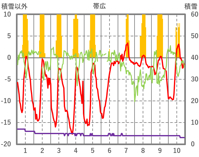 | 日 | 時 | 気温 | 降水 | 風向/風速 | 日照 | 積雪 | 降雪 |