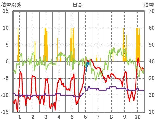 | 日 | 時 | 気温 | 降水 | 風向/風速 | 日照 | 積雪 | 降雪 |